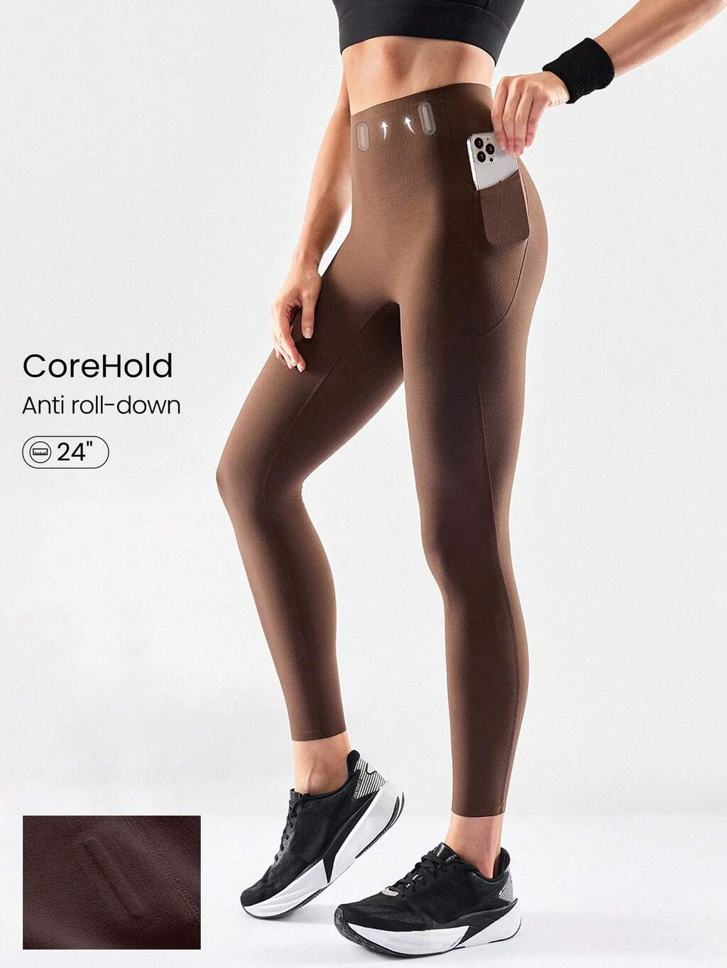 24'' CoreHold FeatherFit™-Sculpt CoreHold No Slip Fit Boning Tummy Control No Front Seam Leggings With Side Pockets Medium Impact Workout Jogging Gym Training