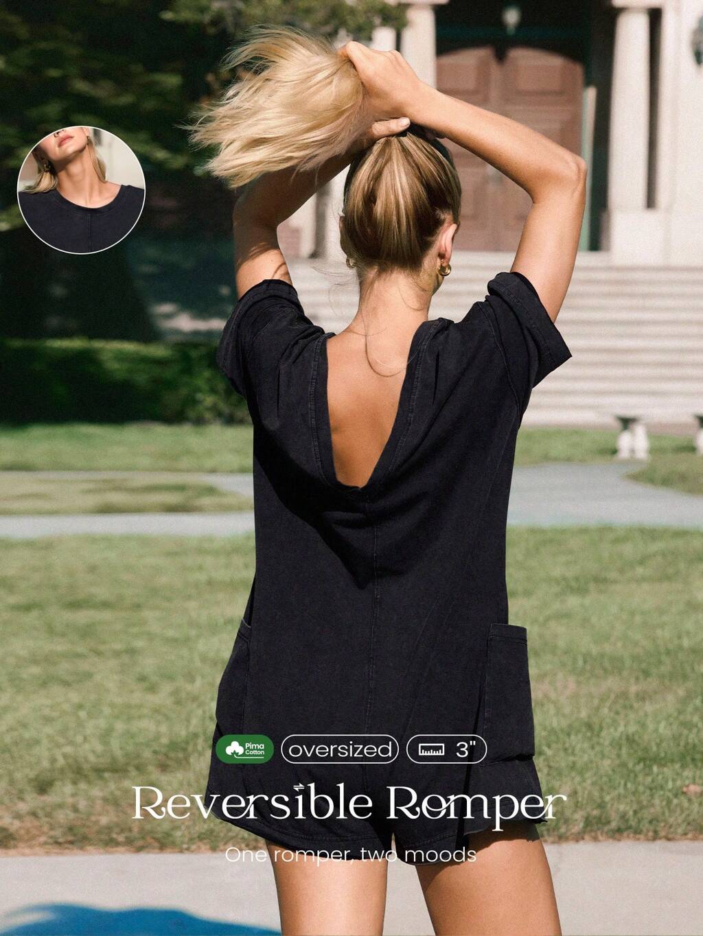3" Washed Pima Cotton Free Stretchy Lightweight Reversible Removable Drawstring Waist Pockets Romper Bodysuit Daily Casual Wear Spring Summer