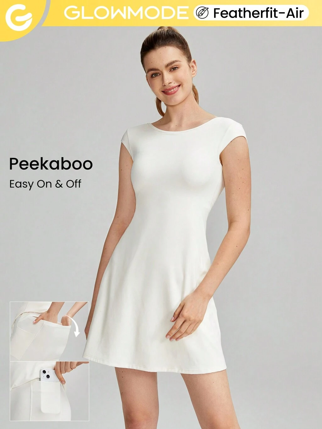 FeatherFit™-Air kurze Ärmel U-Rücken aktive A-Linie Peekaboo Kleid mit eingebauten Shorts für geringen Aufprall Yoga und täglichen Gebrauch, abnehmbare Cups