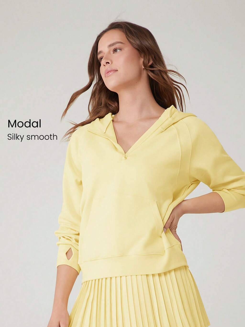 Ultrafeiner, weicher, nahtloser Hoodie mit Daumenöffnungen, seitlichem Schlitz-Saum, mittlerer Stützwirkung für Training, Laufen, Fitness, Gym, Alltag und aktiven Lebensstil