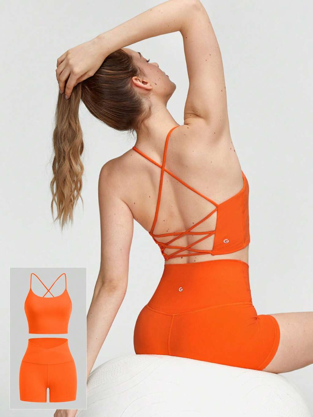 Conjunto de sujetador deportivo y pantalones cortos FeatherFit™ Bra, top de tanque con tirantes de espalda cruzada y pantalón corto de biker con bolsillos laterales de cintura alta para yoga de bajo impacto, carrera diaria, entrenamiento de gimnasio en verano