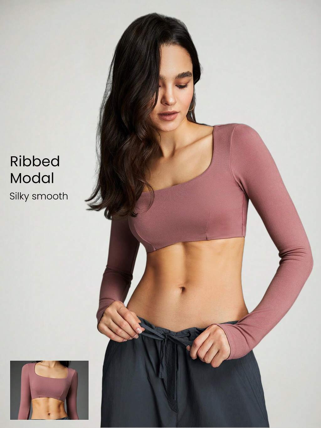 Top Corto Ultra Ribbed Modal Con Cuello Cuadrado, Manga Larga Y Agujero Para El Pulgar