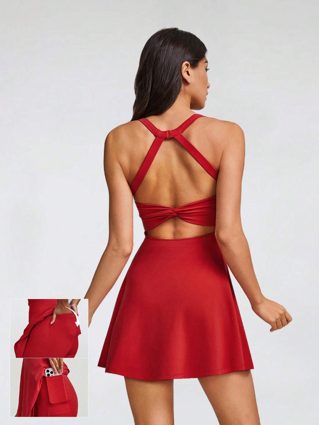 Vestido De Línea A Con Cuello Halter, Corto, Con Bolsillo Anudado Y Construido En Featherfit™-air Game Set, Para Uso Diario De Bajo Impacto