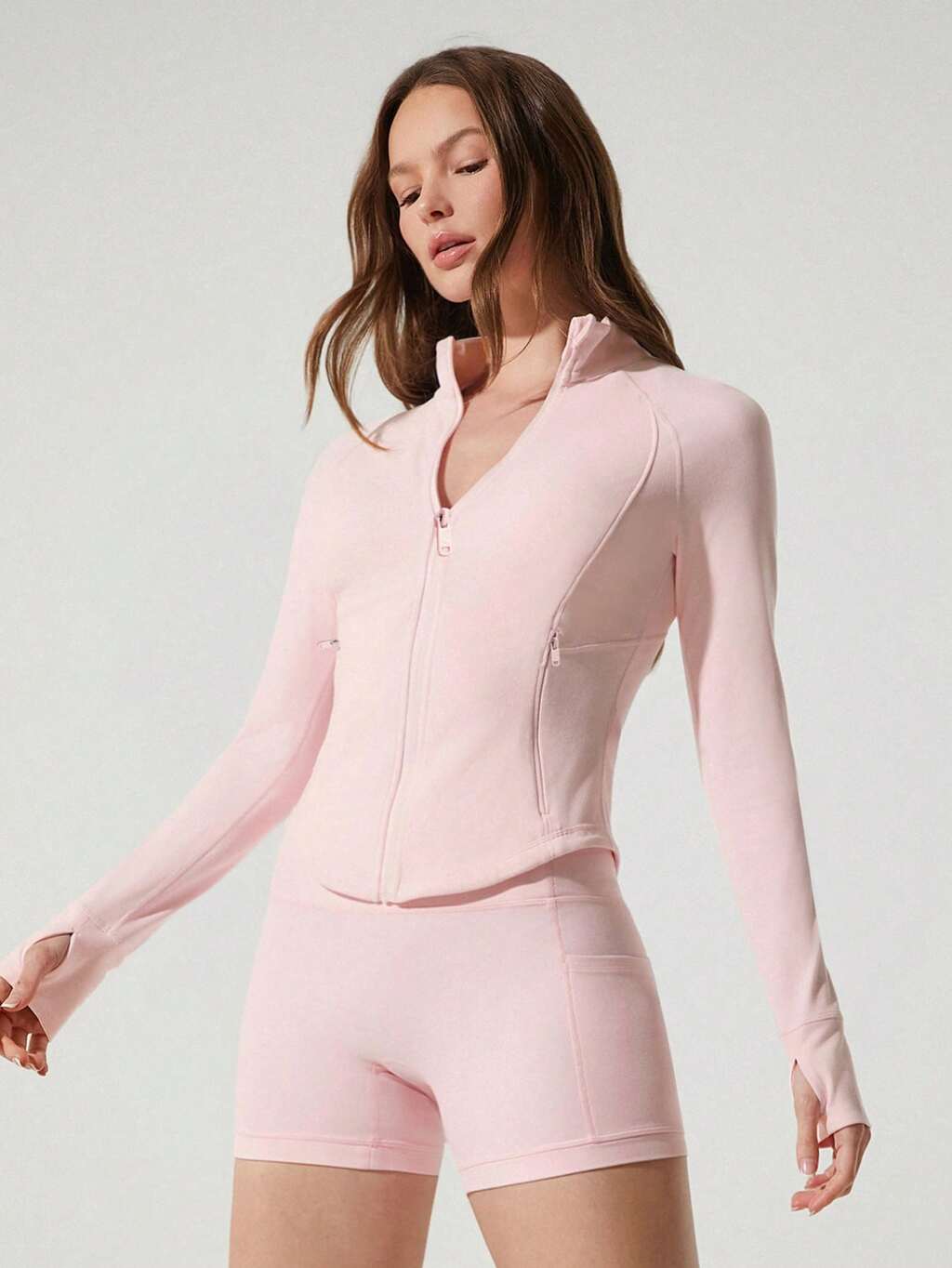 Chaqueta activa de manga larga con bolsillos con cremallera, ajuste delgado y ojales para el pulgar, apropiada para yoga de bajo impacto, Pilates, estudio y uso diario FeatherFit™