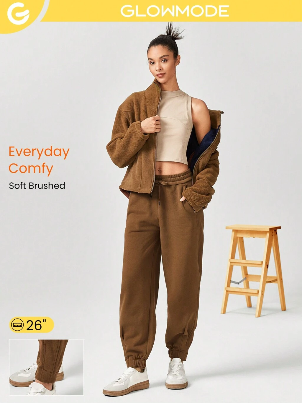 26 po Jogging ample en polaire avec cordon de serrage réglable à la taille, ourlet plissé et poches latérales, pour un usage quotidien décontracté
