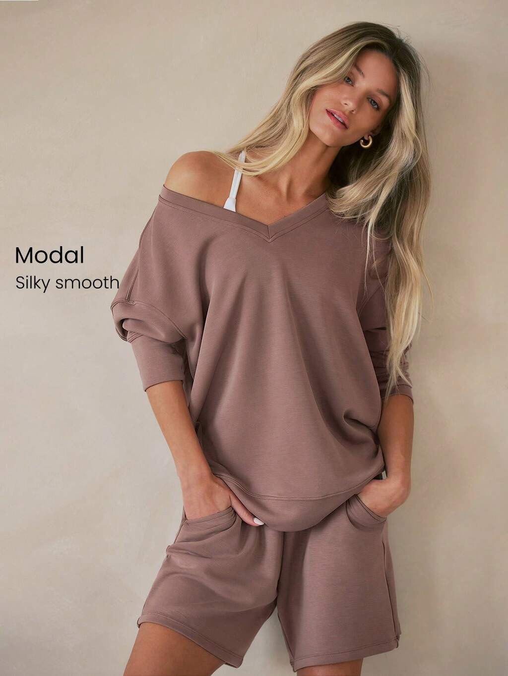 Felpa oversize in modal setoso e liscio, con scollo a V, maniche lunghe e fori per il pollice, adatta per uso quotidiano e casual in autunno e inverno