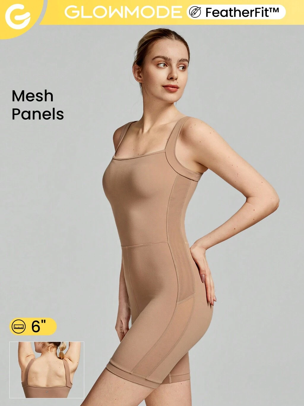 フェザーフィット™ メッシュ ロンパース ボディスーツ 6インチ、アンチスリップ、軽量サポート、ヨガスタジオ、ジム、デイリーに最適