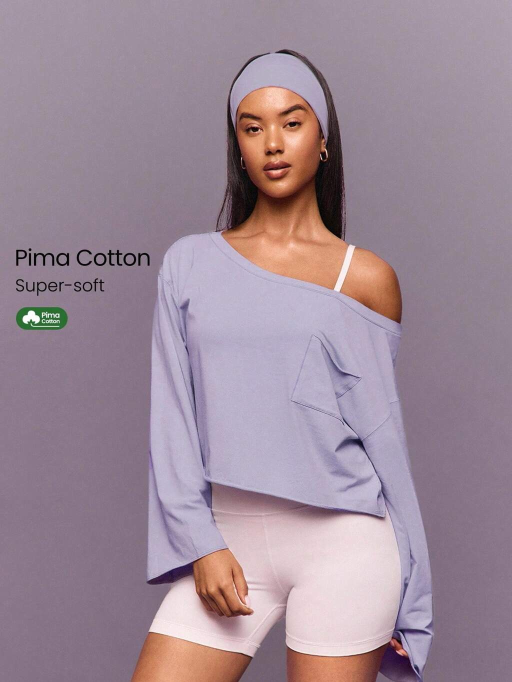 텐셀™ 모달 4.3인치 고타 글로우 비대칭 릴렉스드 쿼터 슬리브 오프숄더 티 & 4.3인치 페더핏™ 버터리 소프트 땀 흡수 하이라이즈 크로스오버 허리 바이커 쇼츠 로우 임팩트 짐 스튜디오 운동 사이클링 러닝 데일리 캐주얼 웨어