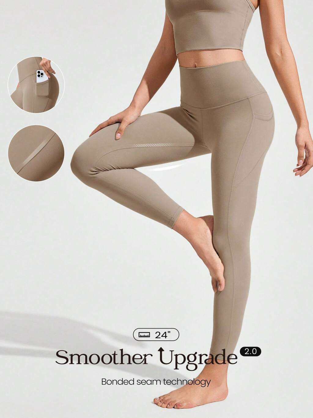 24" FeatherFit™ 부드러운 스웨이 땀 흡수 스트레치 노 프런트 시림 초고리 허리 레깅스, 측면 포켓, 저충격 요가 필라테스 바 스튜디오 일상복