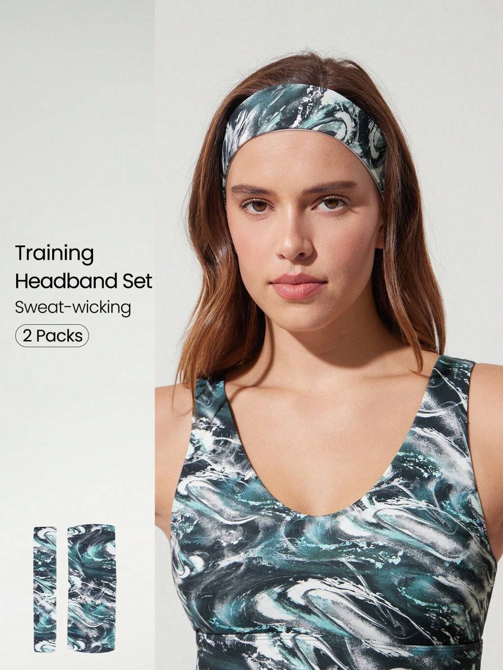 FeatherFit™ 2개입 청색 대리석 무늬 스트레치 부드러운 헤드밴드 세트 체육관 스튜디오 여행 휴가 일상 액티브웨어