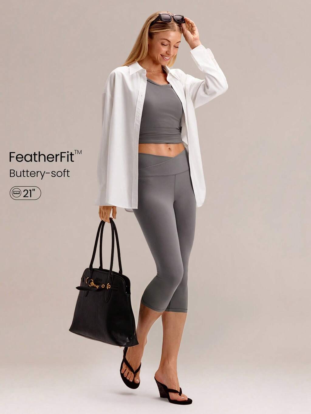 21" FeatherFit™ Crossover Waist Y-Shaped Butt Seam Cutie Capri Leggings Low Impact Yoga Pilates Studio Daily