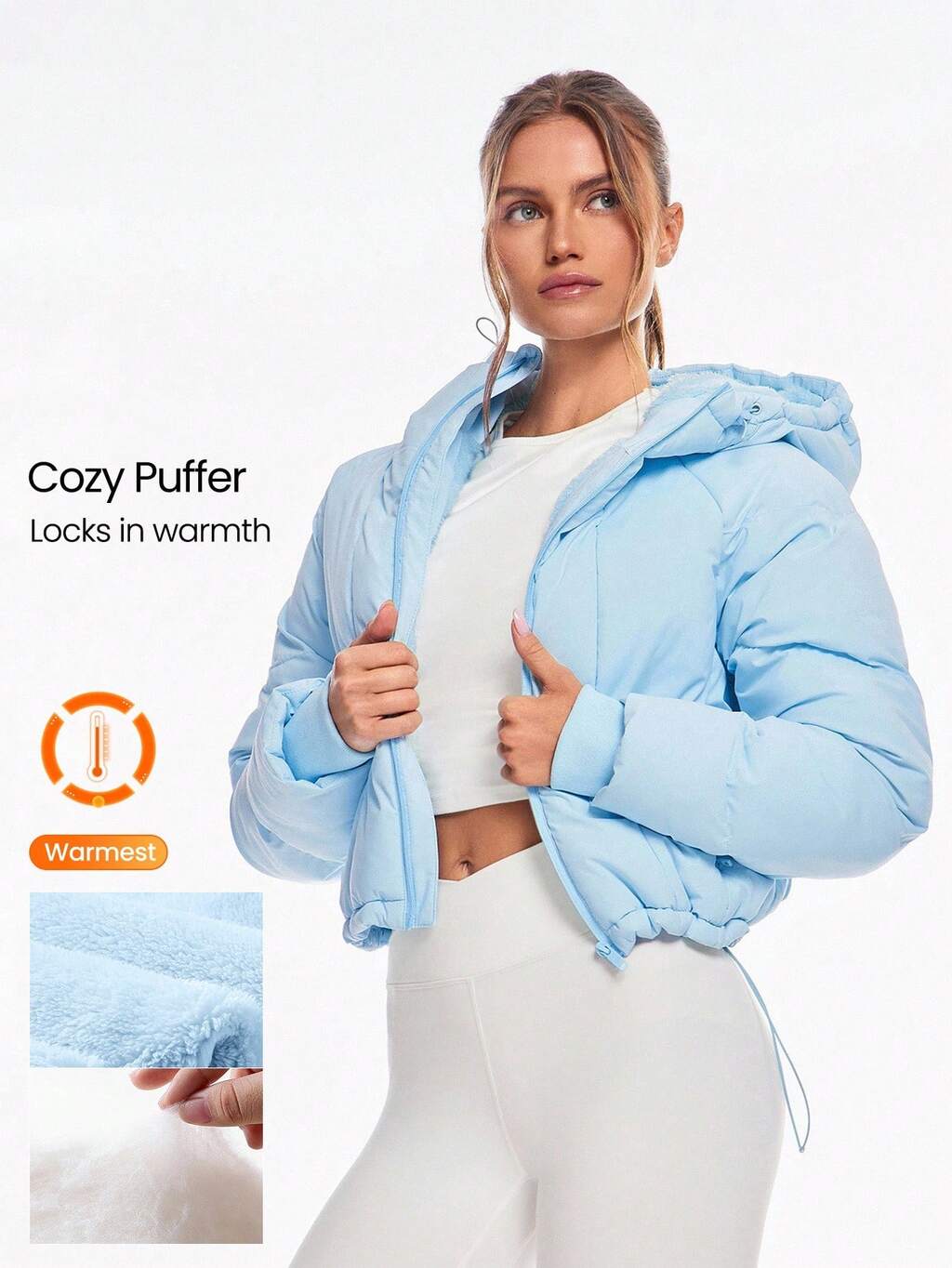 Cozy Crush Silky Smooth Warm Adjustable Drawstring Hem Hood Fleece Lined Cropped Puffer Jacket Autumn Winter Outdoors Daily Casual Wear