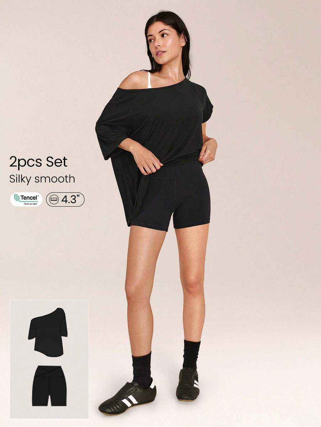 2 Pieces Tencel™ Modal 4.3'' Gotta Glow Asymettric Relaxed Quarter-Sleeve Off-Shoulder Tee & 4.3" FeatherFit™ Buttery-Soft Sweat-Wicking High-Rise Crossover Waist Biker Shorts Low Impact Gym Studio Workout Cycling Running Daily Casual Wear