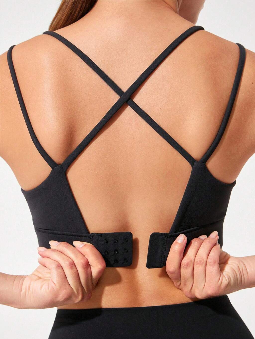 Sujetador deportivo FeatherFit™ con copas incorporadas y espalda de cruce doble, apropiado para yoga, pilates, y uso casual diario de bajo impacto