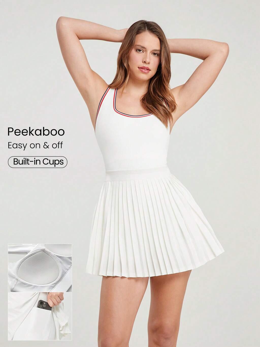 Vestido FeatherFit ™ con pantalón corto incorporado, cintura elástica con pliegues, bolsillos laterales, apto para entrenamiento de bajo impacto, correr, entrenar y gimnasio. Con secado rápido y sostenes incorporados.