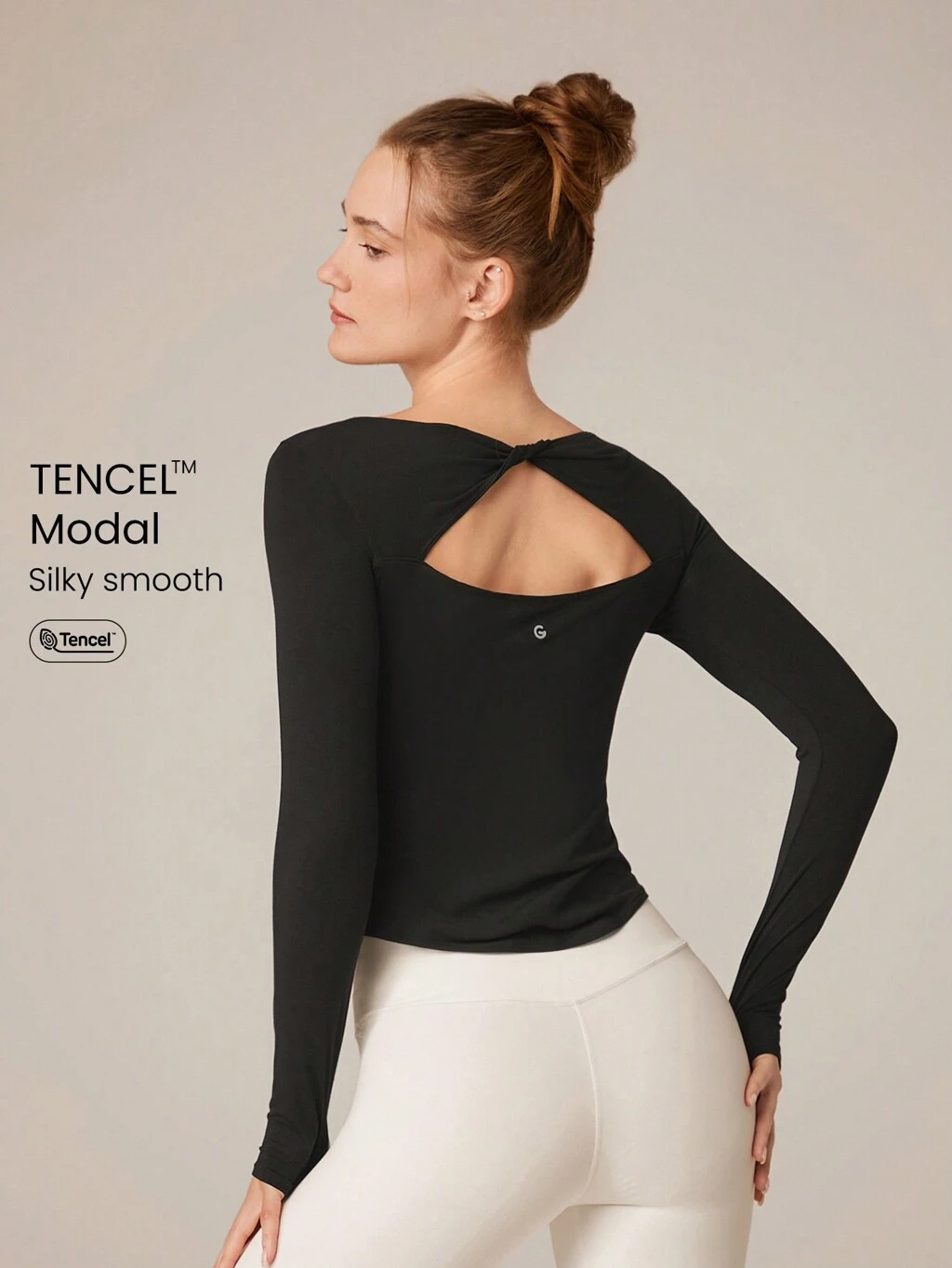 FeatherFit™ Twist And Flow, okrągły dekolt, skręcony tył, otwory na kciuki, wbudowany biustonosz, bluzka z długim rękawem, joga o niskim wpływie, pilates, barre, siłownia, codzienne ubranie na co dzień
